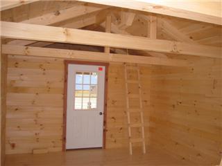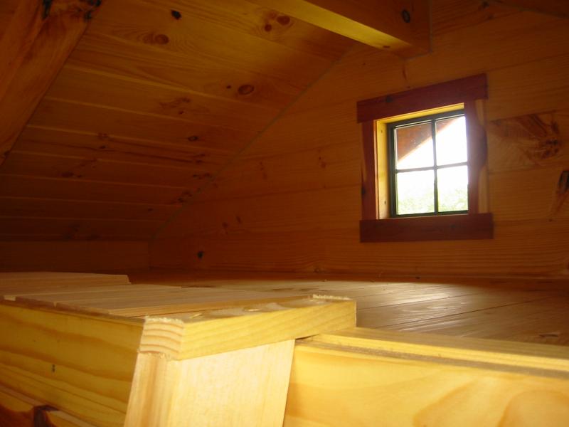 STANDARD: Hunter interior, 1" pine t&g roof sheathing, 2" X 6" pine rafters, 4" X 8" pine tie beam, 4" X 8" solid pine ridge beam, interior windows, door, ladder rungs and loft railing trimmed in rich Aromatic Eastern Red Cedar