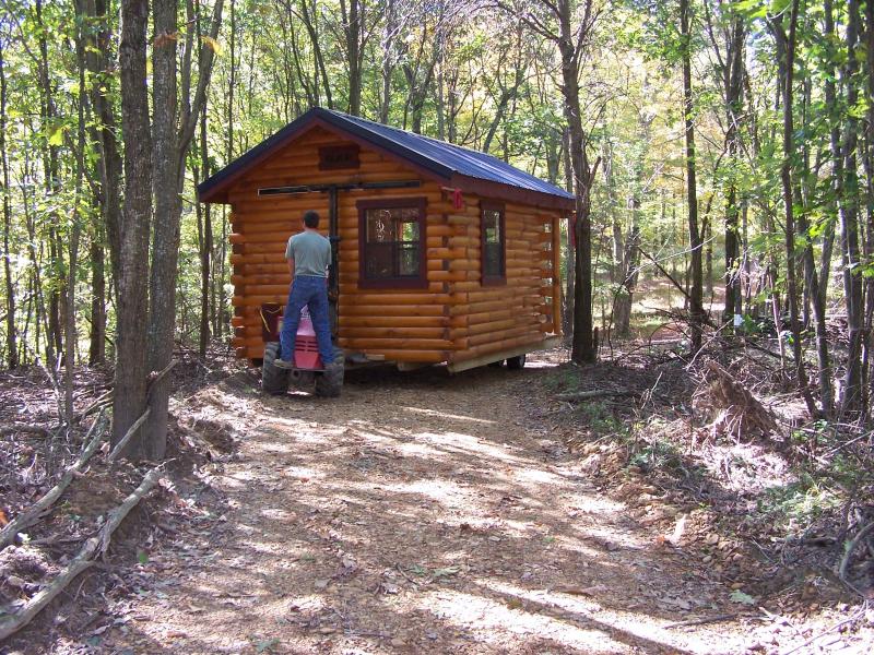 We temporarily mount two wheels to one end of the cabin & lift from the opposite end with the Mule, lift & move to your prepared level pad.