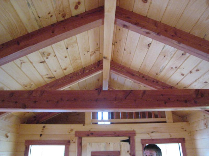 Cabins come STANDARD with 1" Eastern White pine t&g roof sheathing, 2" X 6" Pine rafters and 4" X 8" solid Eastern White pine ridge beam and cedar gable vent. Roof extends 18" past gable ends.