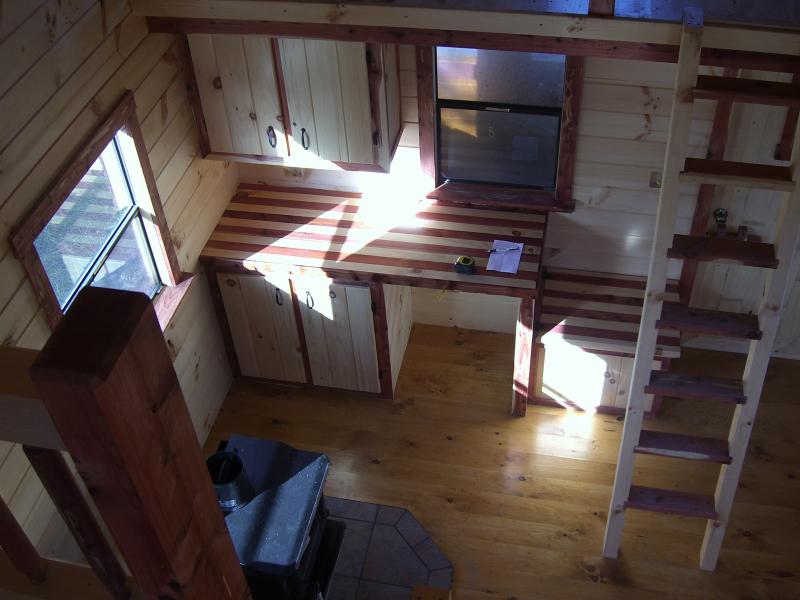 8' loft shown from main floor; Note the rich Aromatic Eastern Red Cedar 4" X 8" X 28' ridge beam, 4" X 6" rafters & tie beams and loft railings