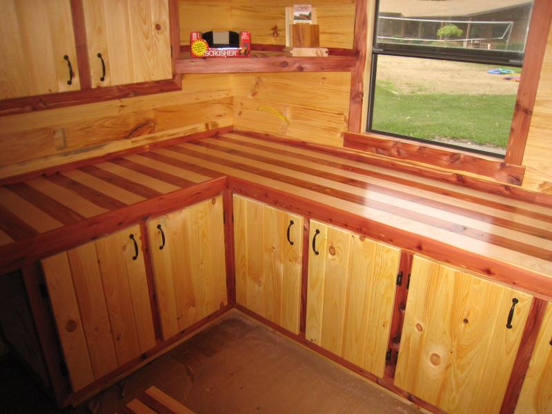 Custom L shaped wraparound kitchenette, with corner bathroom